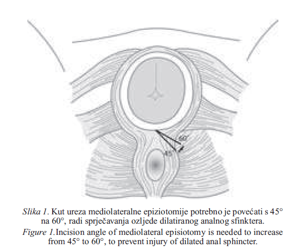 medijana (Sjeverna Amerika). Mediolateralna epiziotomija urezuje se u dužini oko 4 cm od commisurae labiorum posterior (na 6 sati) prema tuber ossis ischii. Kut ureza epiziotomije potrebno je povećati s 45° na 60°, radi sprječavanja ozljede dilatiranog analnog sfinktera (slika 1). Naime, rizik razdora međice III. stupnja značajno opada s povećanjem kuta ureza, s 10% kod kuta <25° na 0,05% kod kuta ureza >45°. Incizija obuhvaća rodnicu, kožu, potkožje, m. bulbocavernosus, m. transversus perinei superficialis i profundus. Metoda je idealna kod instrumentalnog dovršenja poroda (vakuumska ekstrakcija i forceps), makrosomnog djeteta, rađanja zatka, defleksijskih stavova i niske međice. Kod medijane epiziotomije urezuje se centrum tendineum perinei prema čmaru od kojeg treba biti udaljena 2 cm. Režu se rodnica, koža, potkožje i m. bulbocavernosus. Indicirana je kod visoke, rigidne i ožiljkaste međice kojoj prijeti razdor te kod uranjenog rađanja. Zbog blizine čmara, medijana epiziotomija značajno je češće povezana s ozljedama analnog sfinktera i rektuma (III. i IV. stupanj razdora međice).