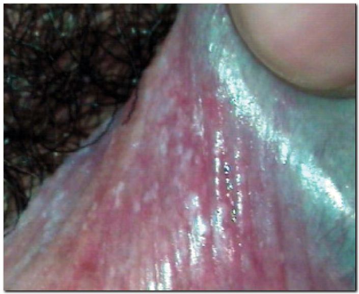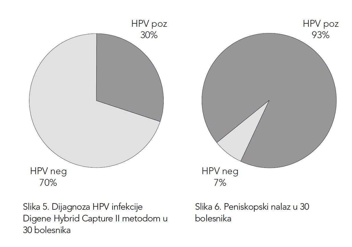 Kod devet od 30 ispitanika (30%) dokazana je pozitivnaHPV infekcija uz Digene Hybrid Capture IImetodu (slika 5). Peniskopijom su u 28 ispitanika (93%) dokazane razne promjene (od ravnih kondiloma do penilnih intraepitelnih neoplazija (PIN) (slika 6). Svih 28 pacijenata je adekvatno liječeno.